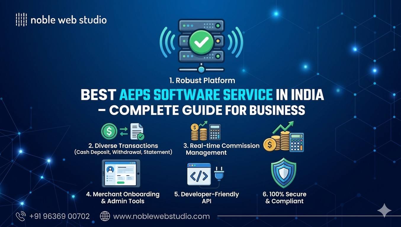 Noble web studio is the best AEPS software provider in India involves prioritizing high transaction success rates (>98%), 99.9% server uptime, instant T+0 settlement, and robust NPCI/RBI compliance. Noble web studio are recognized for high Aeps commission structures (₹5–₹15+ per transaction) and 24/7 technical support, ensuring secure and profitable digital banking services.